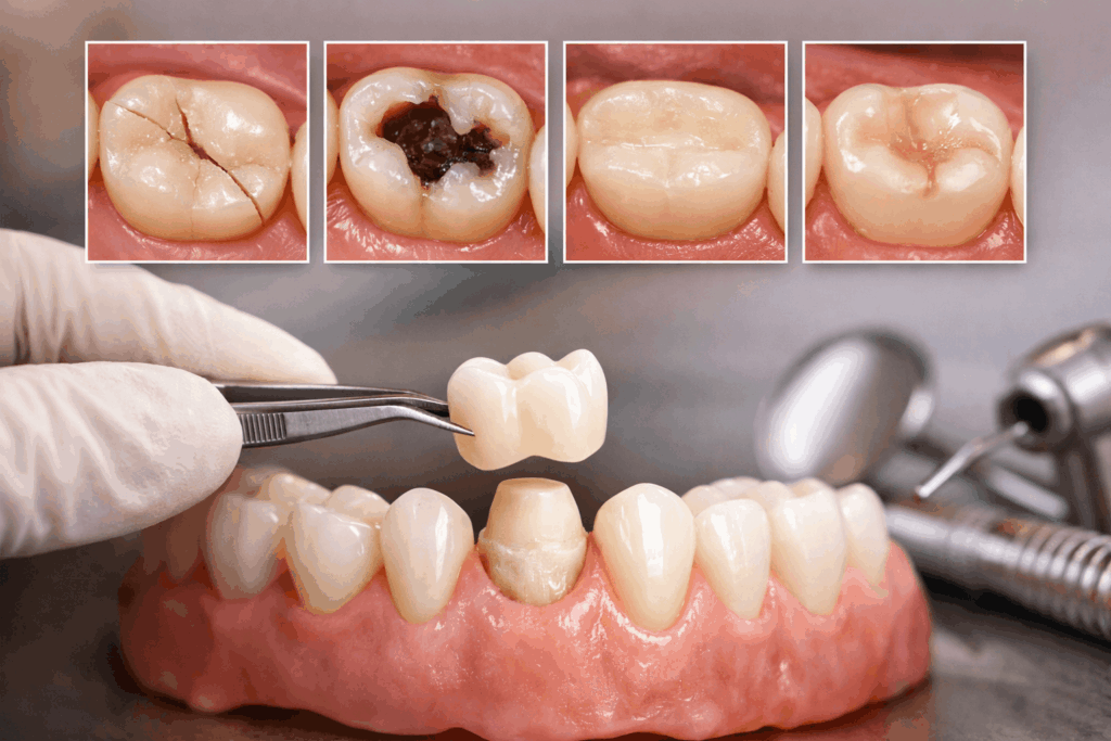 A dental crown is a protective cap placed over a damaged or weakened tooth. It restores shape, strength, and function. Crowns are often recommended when a tooth cannot hold a filling or has undergone root canal treatment.